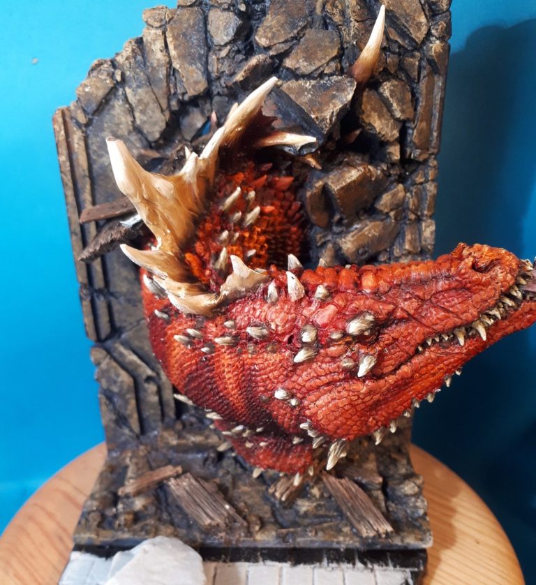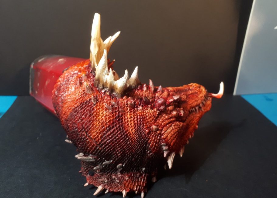 Still a lot of details to add in, the larger spines around the back of the jaw have been undercoated with a bone coloured acrylic, and the teeth and the spines along the dragon’s back will receive a similar treatment prior to adding oil colours.