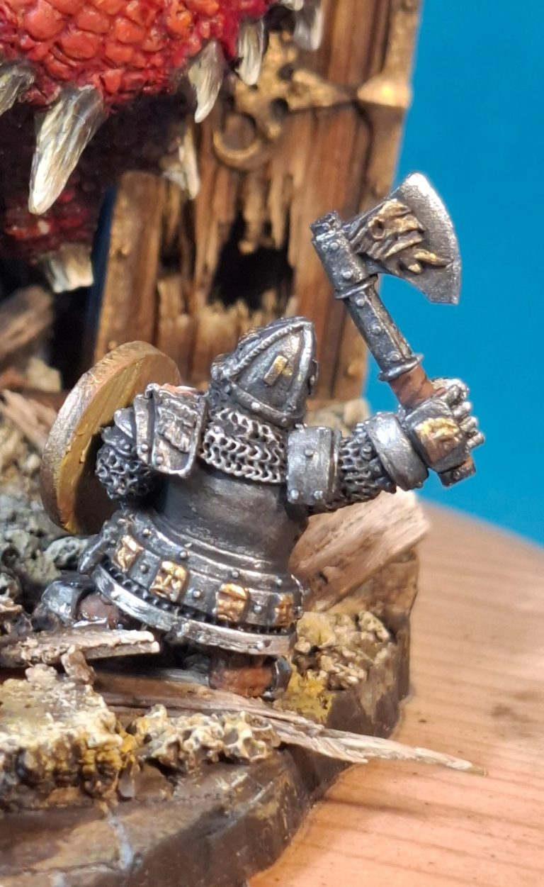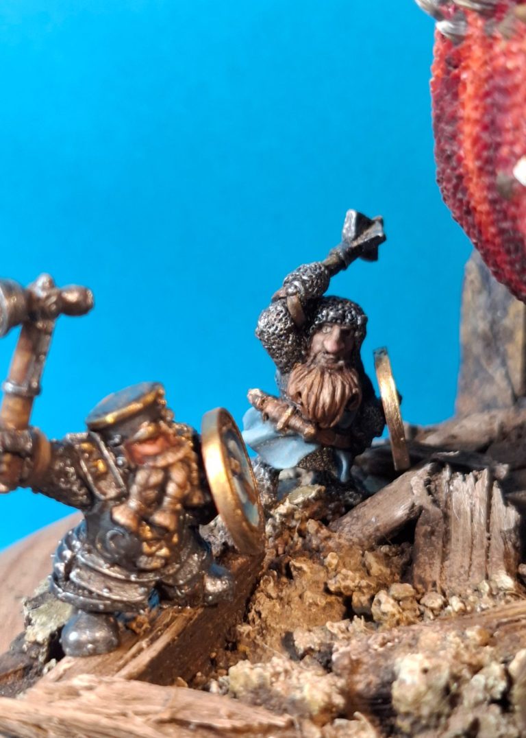 The three dwarves were positioned on the debris with the third figure looking back at the commander as though saying “I’ll need a bigger hammer !”, which gave me the opportunity to have his face visible to the viewer.