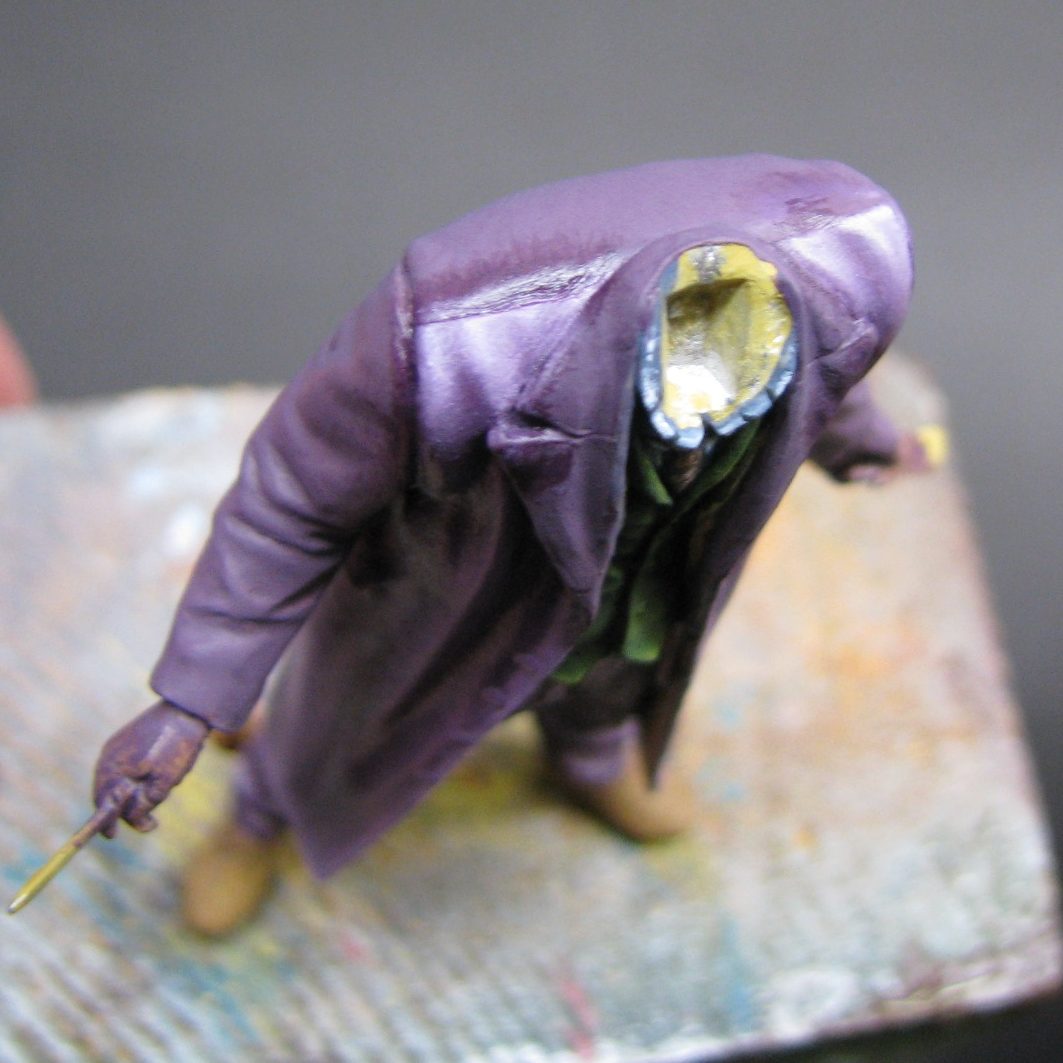 Photo #3 starts us off on the main body section. I decided to paint from the inside outwards, beginning with those shockingly purple trousers. I used games Workshop Imperial Purple for an undercoat, and after building up a solid colour with that – probably three or four thin coats – I then added oils over the top to start the highlighting and shading process.