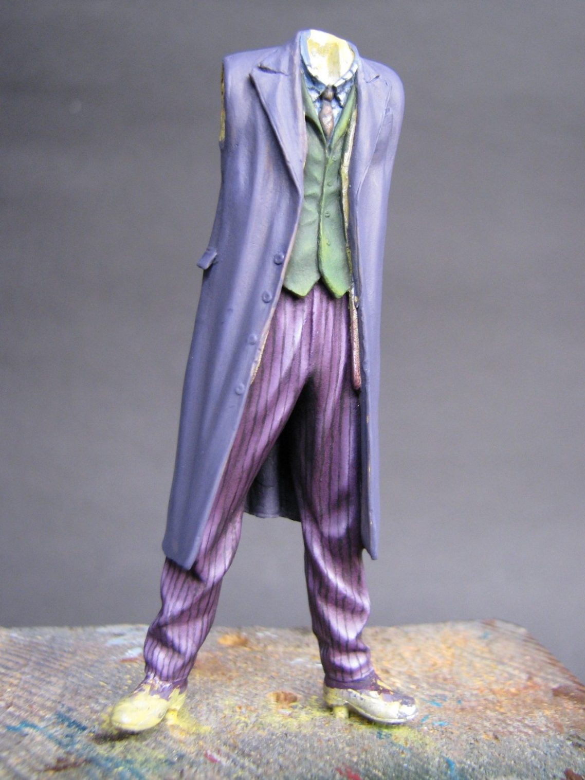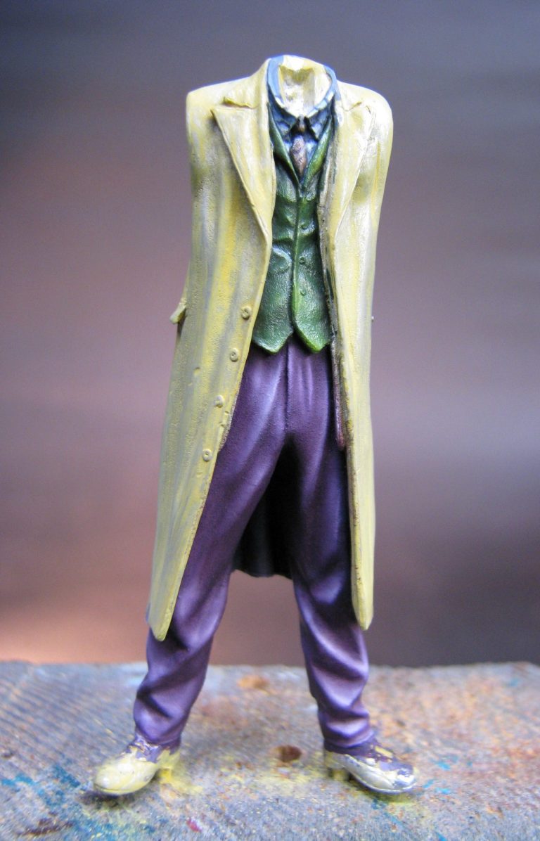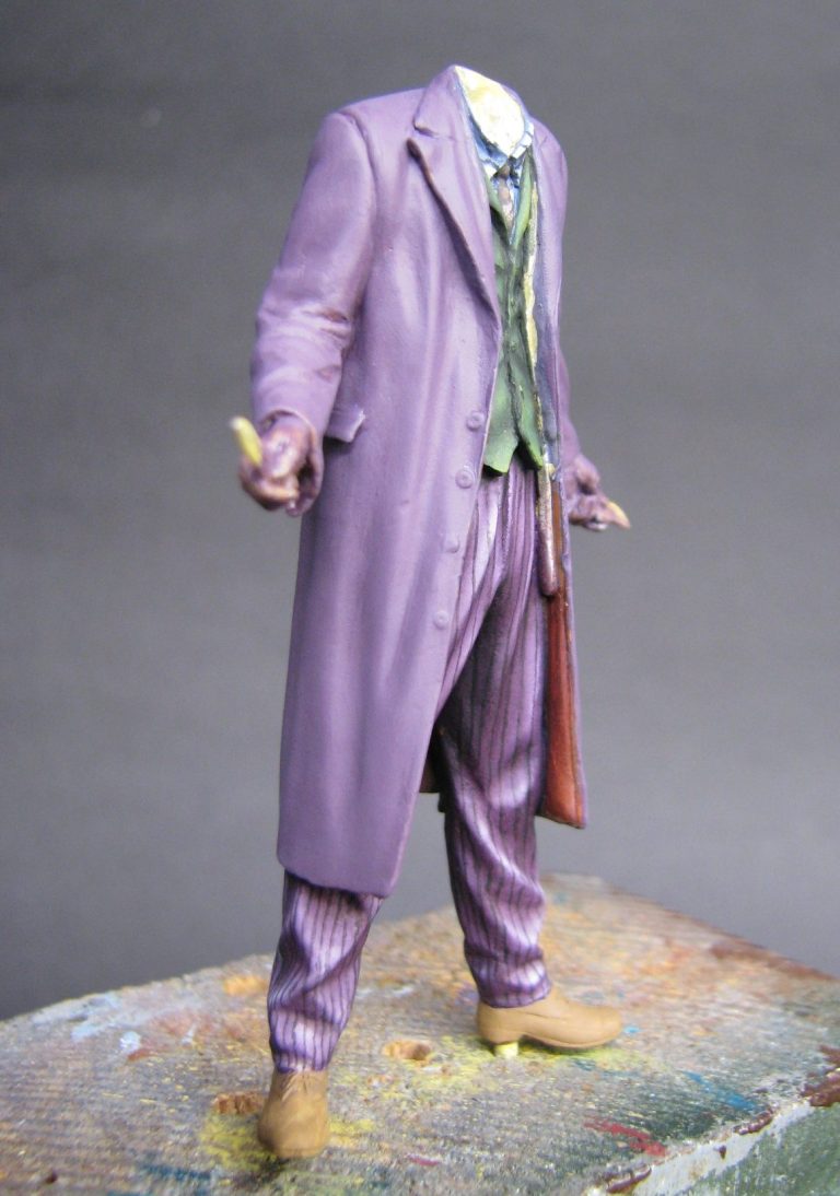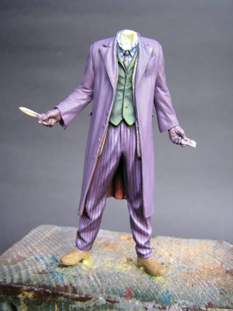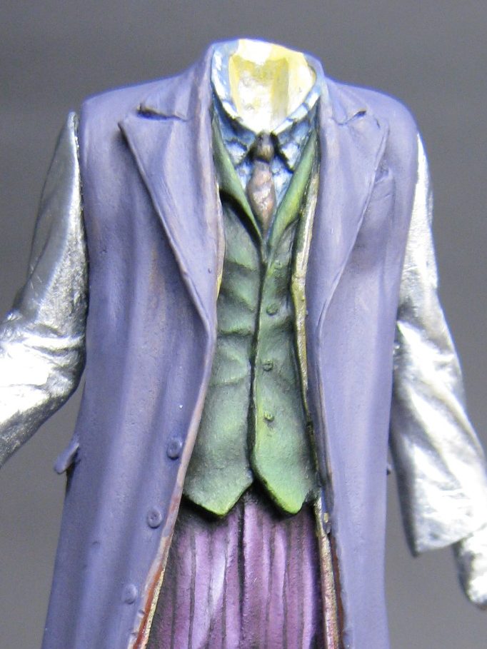 Talking of research, I hadn’t realised that the lining of the Joker’s coat is red. Yes it is ( people have told me it isn’t; but unfortunately there’s a couple of good reference shots that show in fact it is…..proving them wrong ). Happily I noticed this early on, and although I’d got the trousers painted, it was easy enough to get to the lining areas that are visible and paint in a nice red colour.
