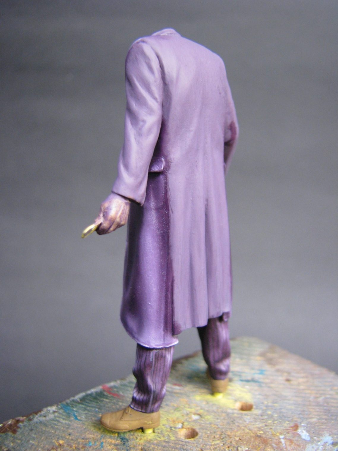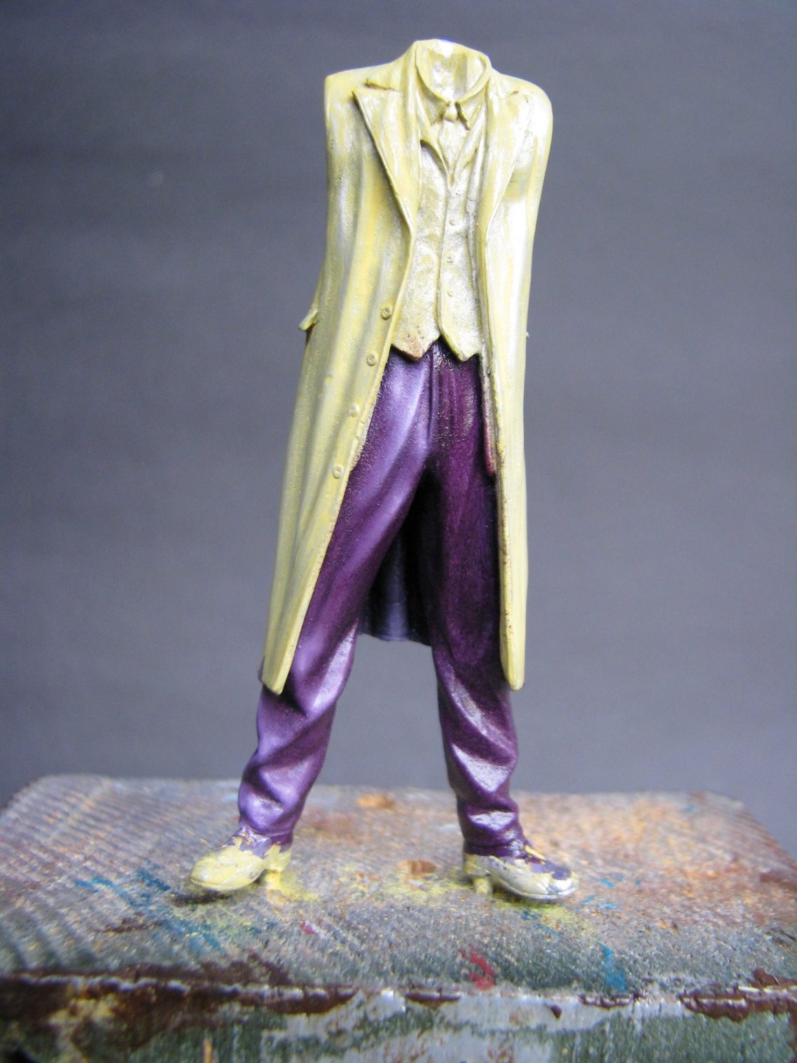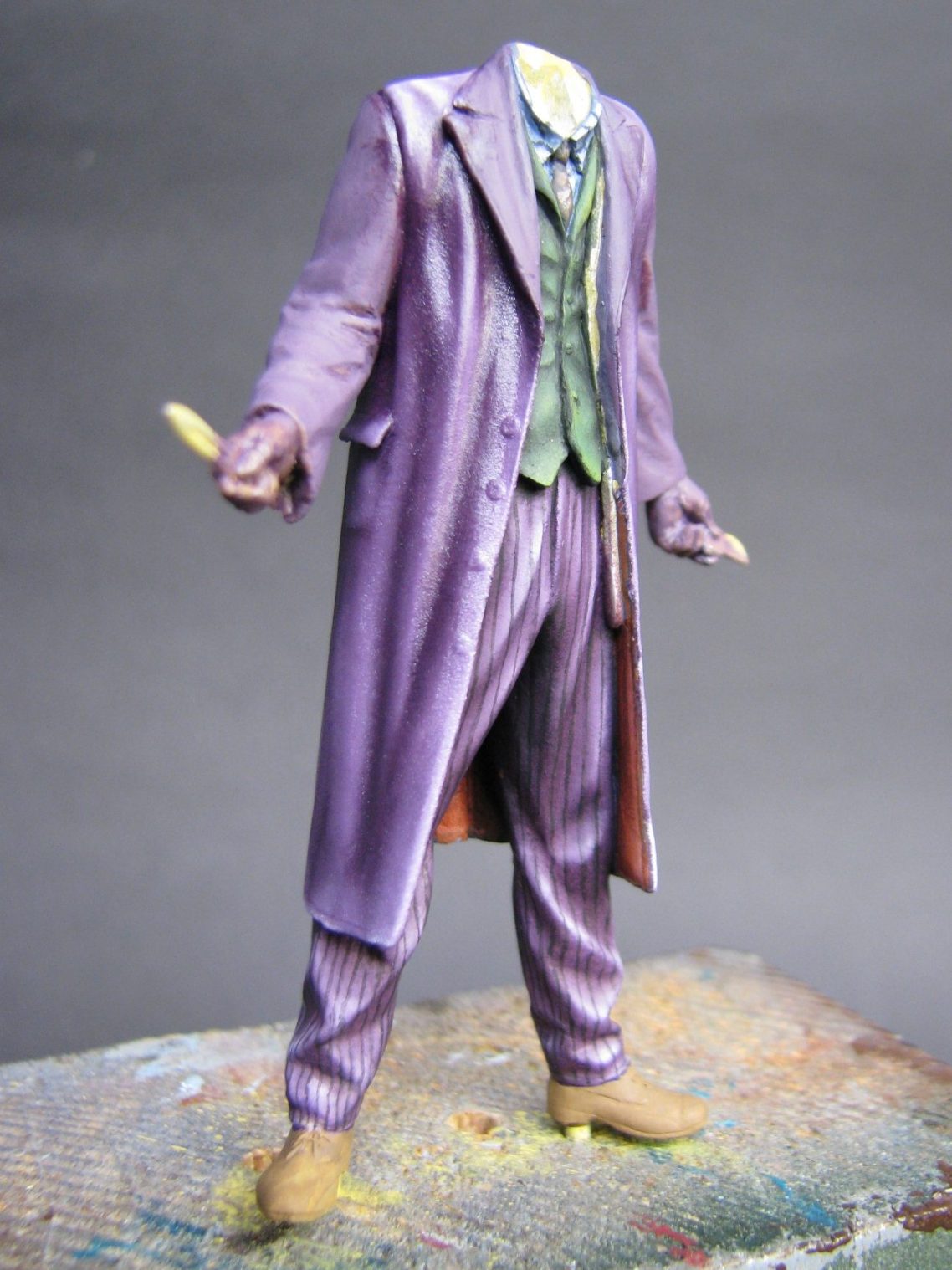 Talking of research, I hadn’t realised that the lining of the Joker’s coat is red. Yes it is ( people have told me it isn’t; but unfortunately there’s a couple of good reference shots that show in fact it is…..proving them wrong ). Happily I noticed this early on, and although I’d got the trousers painted, it was easy enough to get to the lining areas that are visible and paint in a nice red colour.