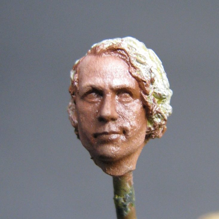 To run through the process though, the face was painted normally with flesh colours, adding highlights and shadows just like any other figure. That was allowed to dry thoroughly – about a week in the drying cabinet, simply because I’d be mistreating it for the next process.