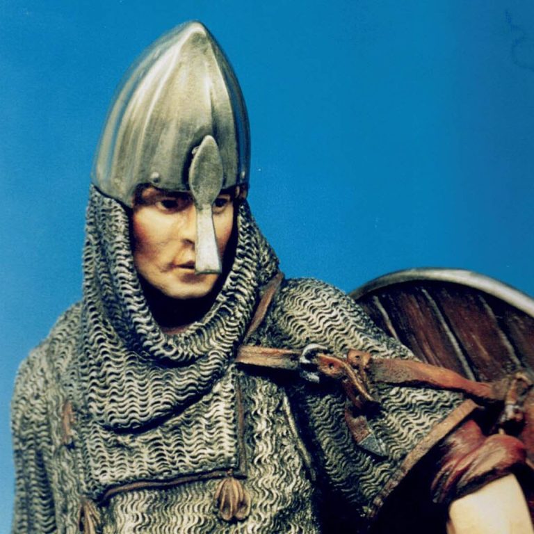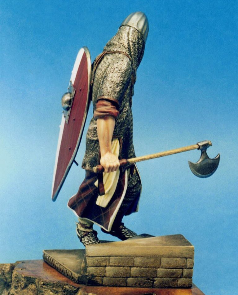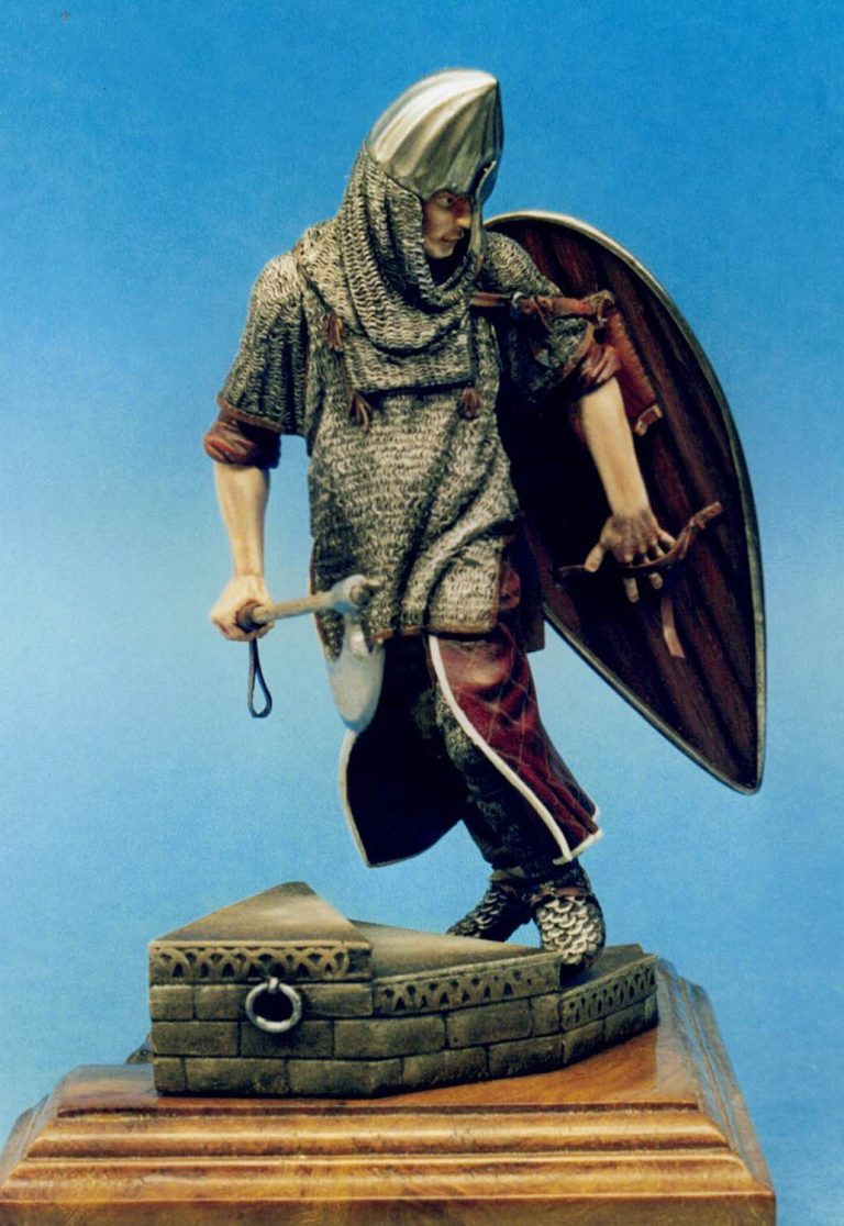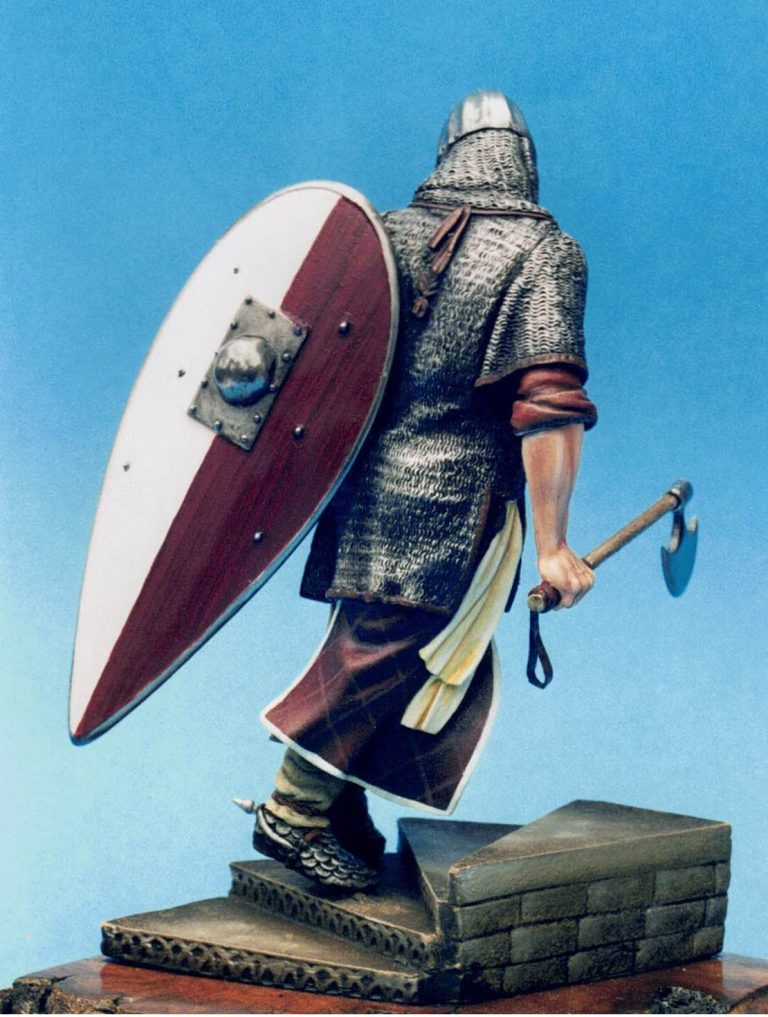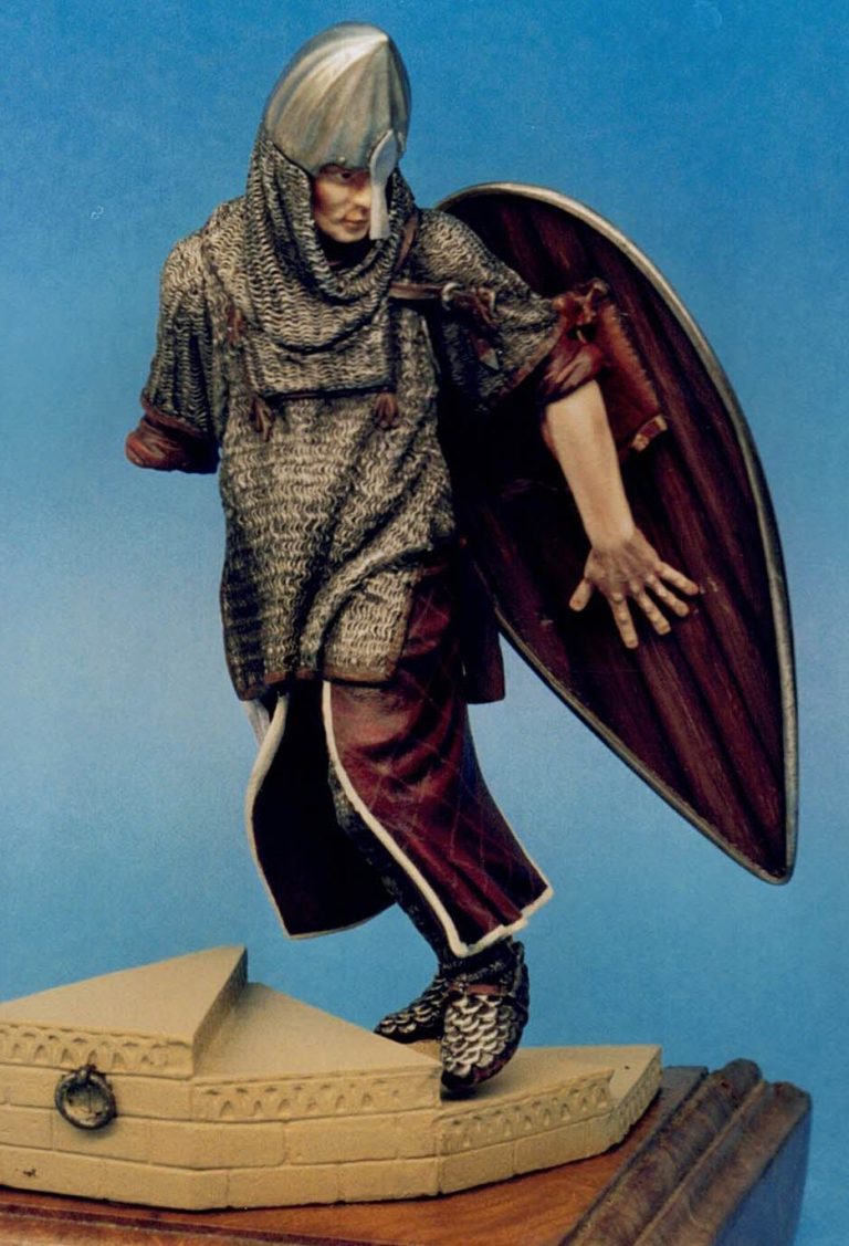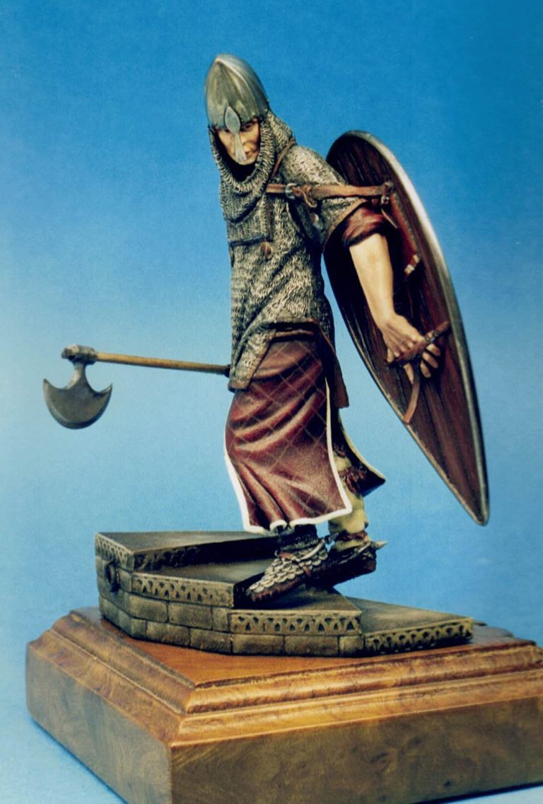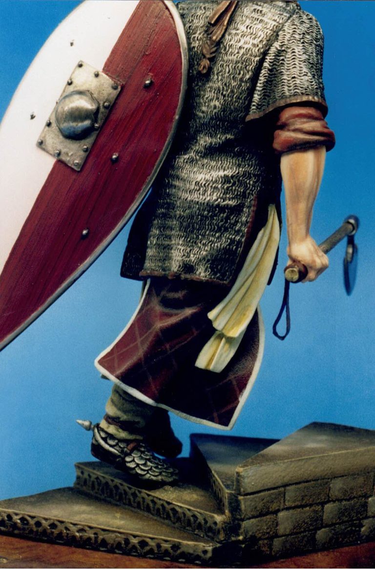 I’d stuck with a limited palette here, opting for the obvious silver’s for the metal areas and a burgundy colour for the clothing and with only a slight difference for the wood of the shield.