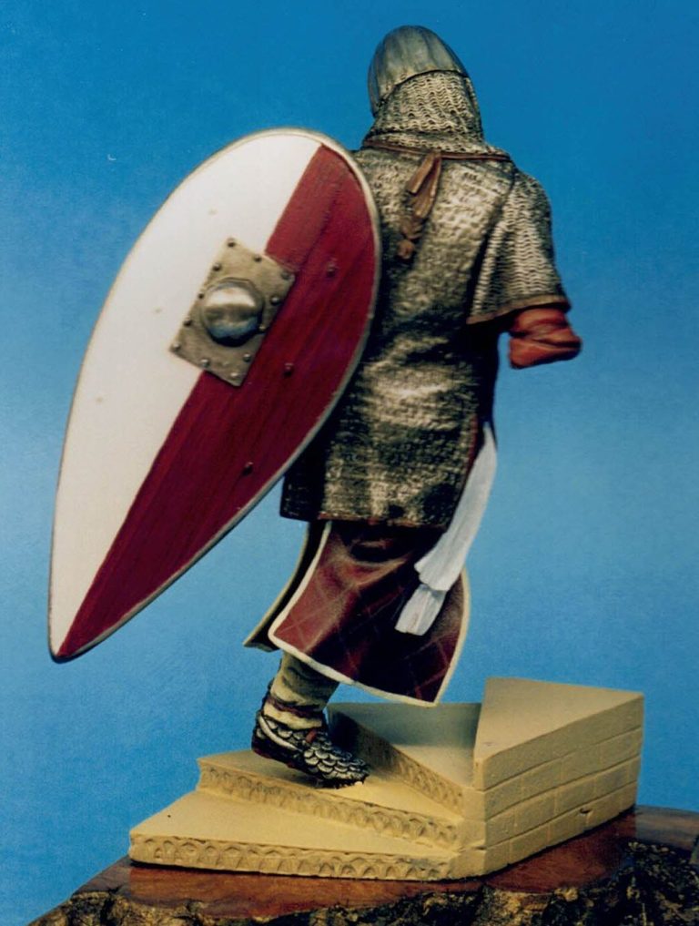 Photo #7 and a look at the back of the figure. The slight woodgrain effect on the burgundy area of the shield can be seen here – simply a case of leaving brush marks in the paint whilst using a sweeping, downward motion to finish the area.